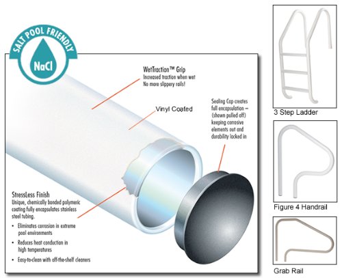 These salt friendly rail goods will not corrode in a salt water pool. Durable stainless steel rails are housed in a protective coating that virtually eliminates corrosion. This protective coating is made with Wetraction Grip'' to provide non-slip gripping on our ladders and handrails. Available in white only. Escutcheons included.