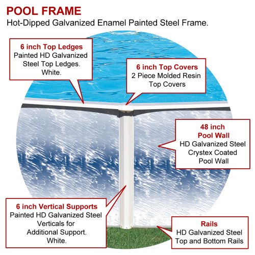 This Heritage Pools 48-in complete round pool package brings cool fun in the sun to your backyard with a 48-in depth and an included 3/4-HP Fiber Bond Cartridge Skim Filter. It's crafted with a 6-in, heavy-duty, galvanized steel frame and an all-weather vinyl liner. It comes with a resin ladder for easy access and a pool installation video.